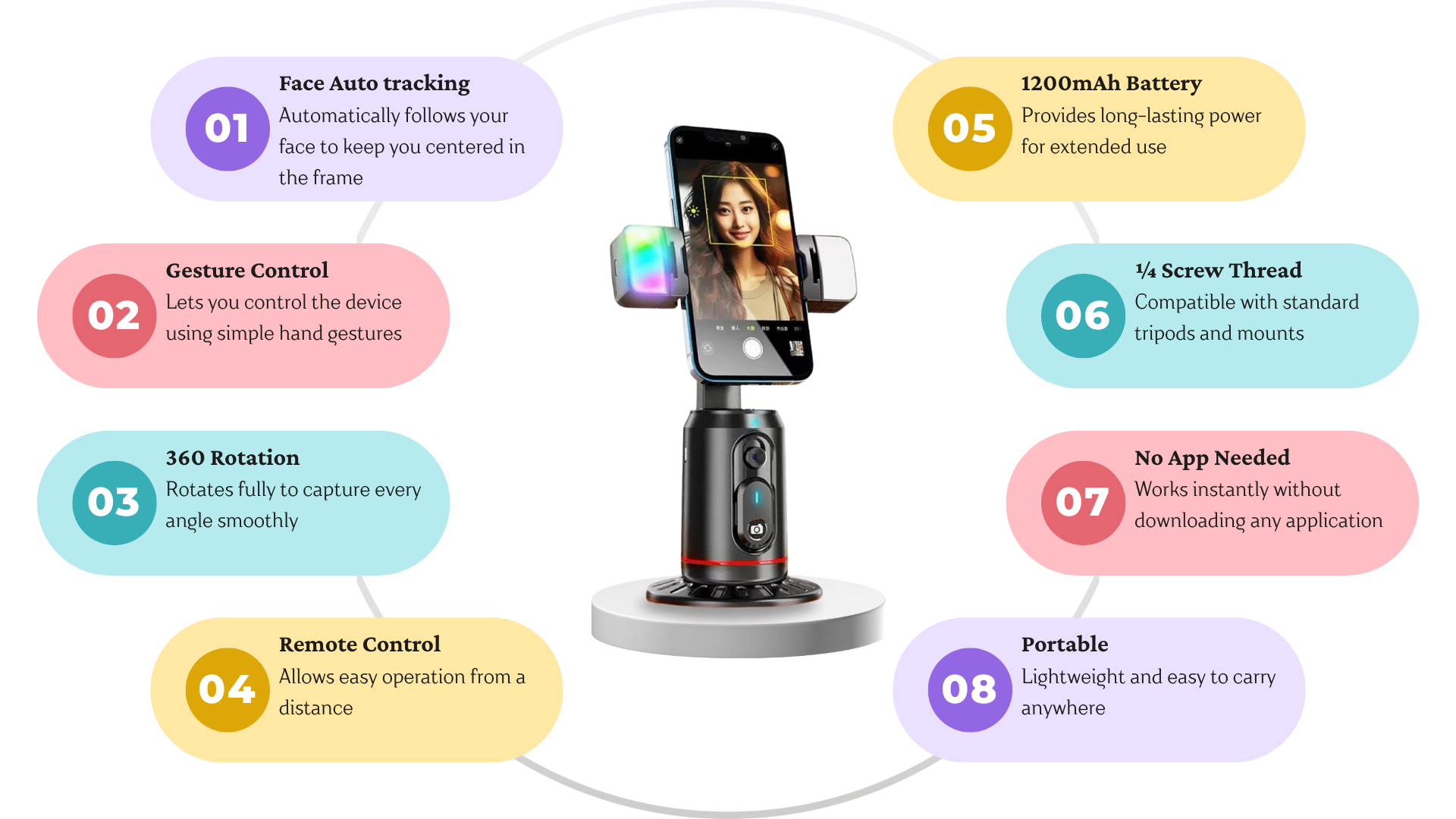 No — this 360 Auto Face Tracking Gimbal does not require an app to use face tracking